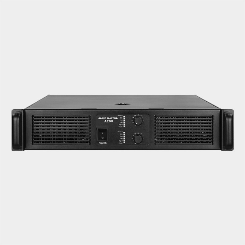 Audio master A200. Επαγγελματικός τελικός ενισχυτής 2x500W RMS 2Ω , 2x375W RMS 4Ω. 2x250W RMS 8Ω . Bridge 8Ω 1x700W RMS Bridge 4Ω 1x1000W RMS. Λειτουργία class H .Ευαισθησία εισόδου 0,775V,1V,1,4V. Παραμόρφωση <0.05%@8Ω 1KHz. Διαθέτει Limiter καθώς και φίλτρο 30HZ high & low pass. Διαθέτει εισόδους XLR & link XLR , εξόδους speakon & μπόρνες για γυμνό καλώδιο . Ανεμιστήρες μεταβλητής ταχύτητας. Διαθέτει κύκλωμα ομαλής εκκίνησης , DC faults,προστασία υπερθέρμανσης , υπερφόρτωσης, βραχυκυκλώματος. Προτείνεται όπου χρειάζεται υψηλή ποιότητα & αξιόπιστη λειτουργία . Διαστάσεις (HxWxD) 88x482x425mm . Βάρος 14 kg.